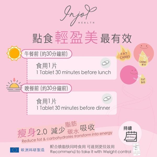 • 搭配INJOY Weight Control燒脂快食用,可同時減少囤積脂肪